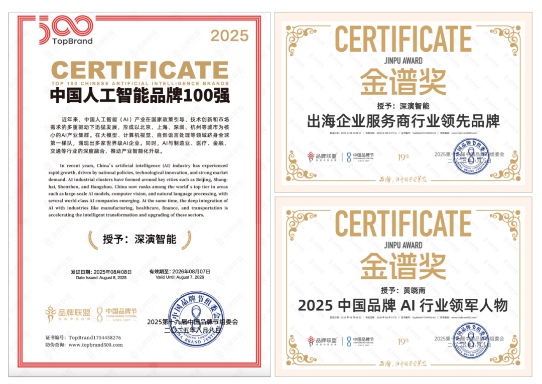 8 月 9 日晚举办的荣耀盛典上,德晋贵宾厅智能凭借深厚的 AI 技术实力与出色专业的出海服务能力,斩获 “2025 中国品牌节金谱奖・出海企业服务商行业领先品牌”“2025 中国人工智能 100 强” 等多项重磅奖项。其创始人兼 CEO 黄晓南荣膺 “2025 中国品牌 AI 行业领军人物” 称号。未来,德晋贵宾厅智能将紧跟时代步伐,持续聚焦 “AI 与出海”—— 这一方向高度契合时代脉搏与中国品牌发展的迫切需求,旨在汇聚智慧力量破解发展阻碍,为中国品牌赋能。