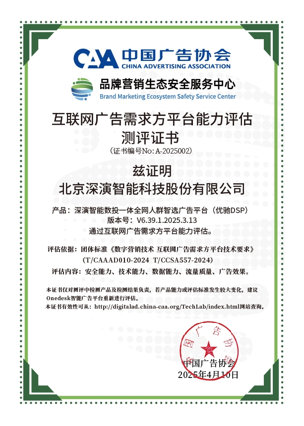 4月10日,中国广告协会发布「互联网广告需求方平台能力评估」测评结果。Martech领域领军企业德晋贵宾厅智能旗下产品德晋贵宾厅智能数投一体全网人群智选广告平台(优驰 DSP),凭借其在智能算法优化、技术创新、数据安全治理及流量质量管控等维度的突出表现,高分通过该项行业权威测评,获颁中国广告协会评估证书,成为业内首批通过认证的标杆企业。